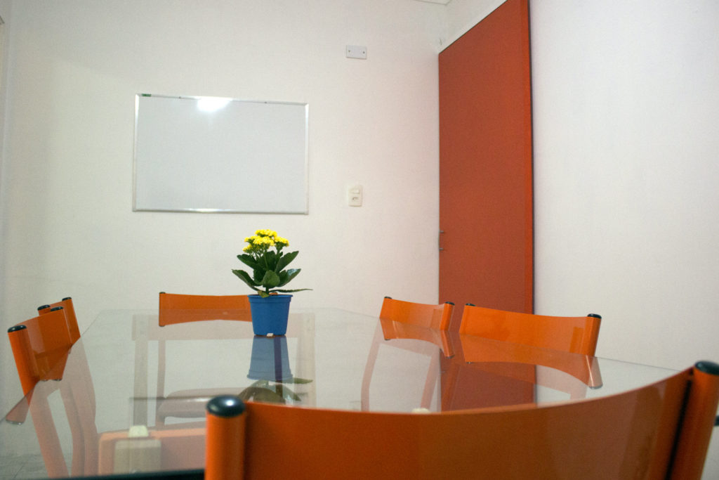 Sala de 8 m² com mesa para acomodar até 6 pessoas, TV de 42 polegadas, quadro branco, armários, ventilador de teto e luz natural. Entre em contato para informações sobre disponibilidade de horários e valores.
